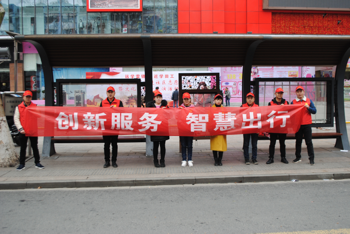 图为路车志原者们在步歩高站牌合影拍摄留念