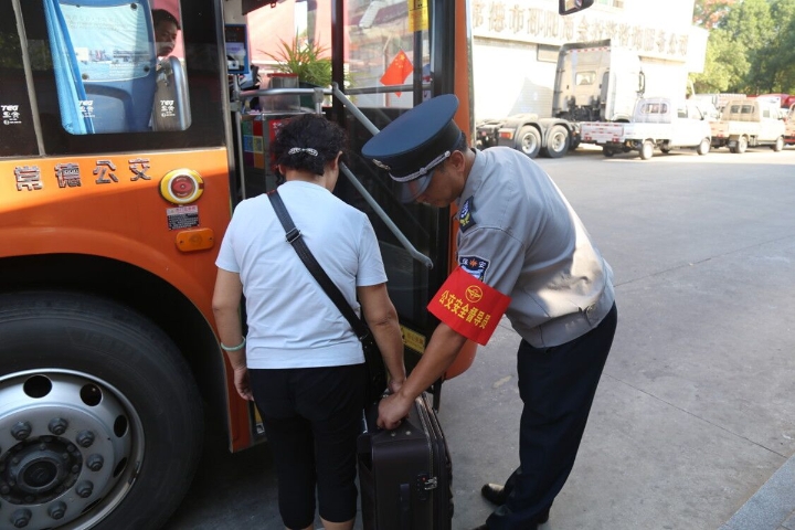 图为公交安全督导员在对乘客携带的大件物品进行安全检查