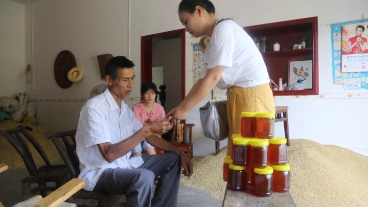 图为公司工会办负责人正在结对帮扶对象家中购买蜂蜜