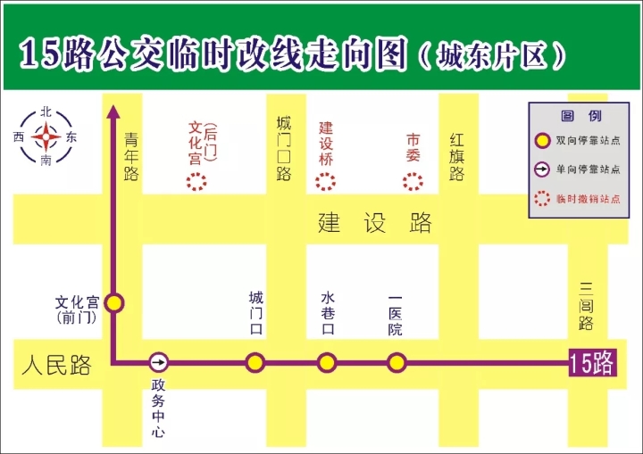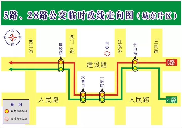 5路、28路线由农资大市场始发,原线行驶至建设东路后左转进入红旗路,再经人民路、城门口路后左转回建设路恢复原线行驶(原线返回)。