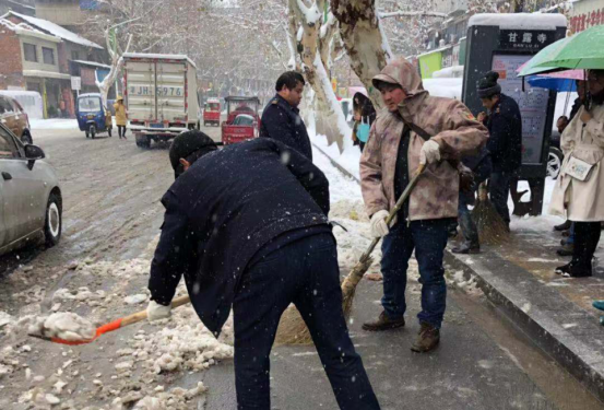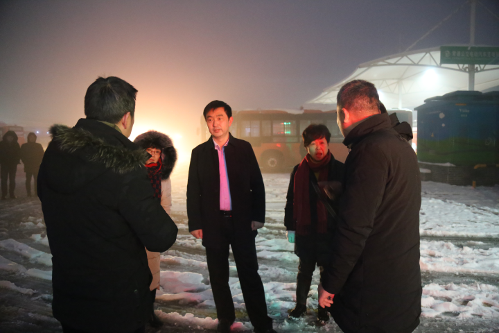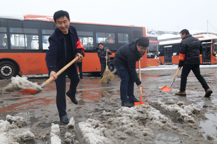 图为市公共汽车工司班子会员正领着年轻干部在职员工开展调研铲雪除冰事业