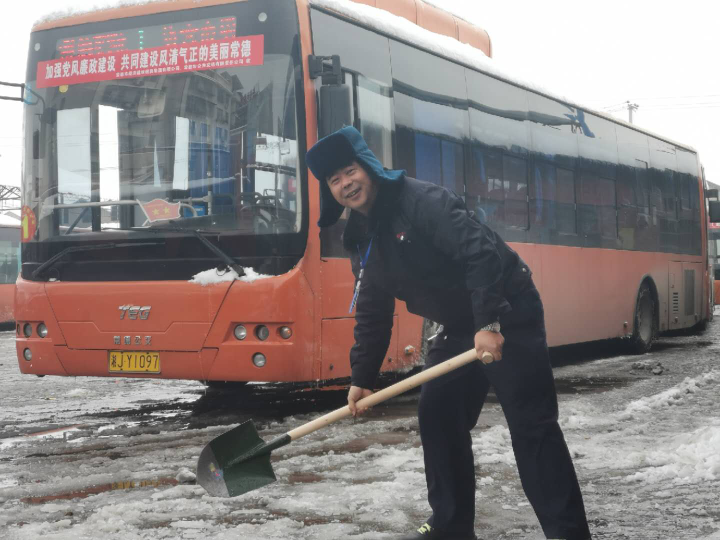 图为公汽大公司架驶员目前在农资大的市场坪内除掉路面雪