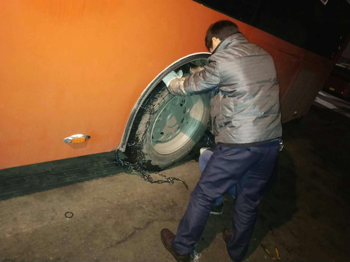 图为修复工半夜三更长期加班组装防滑装置链