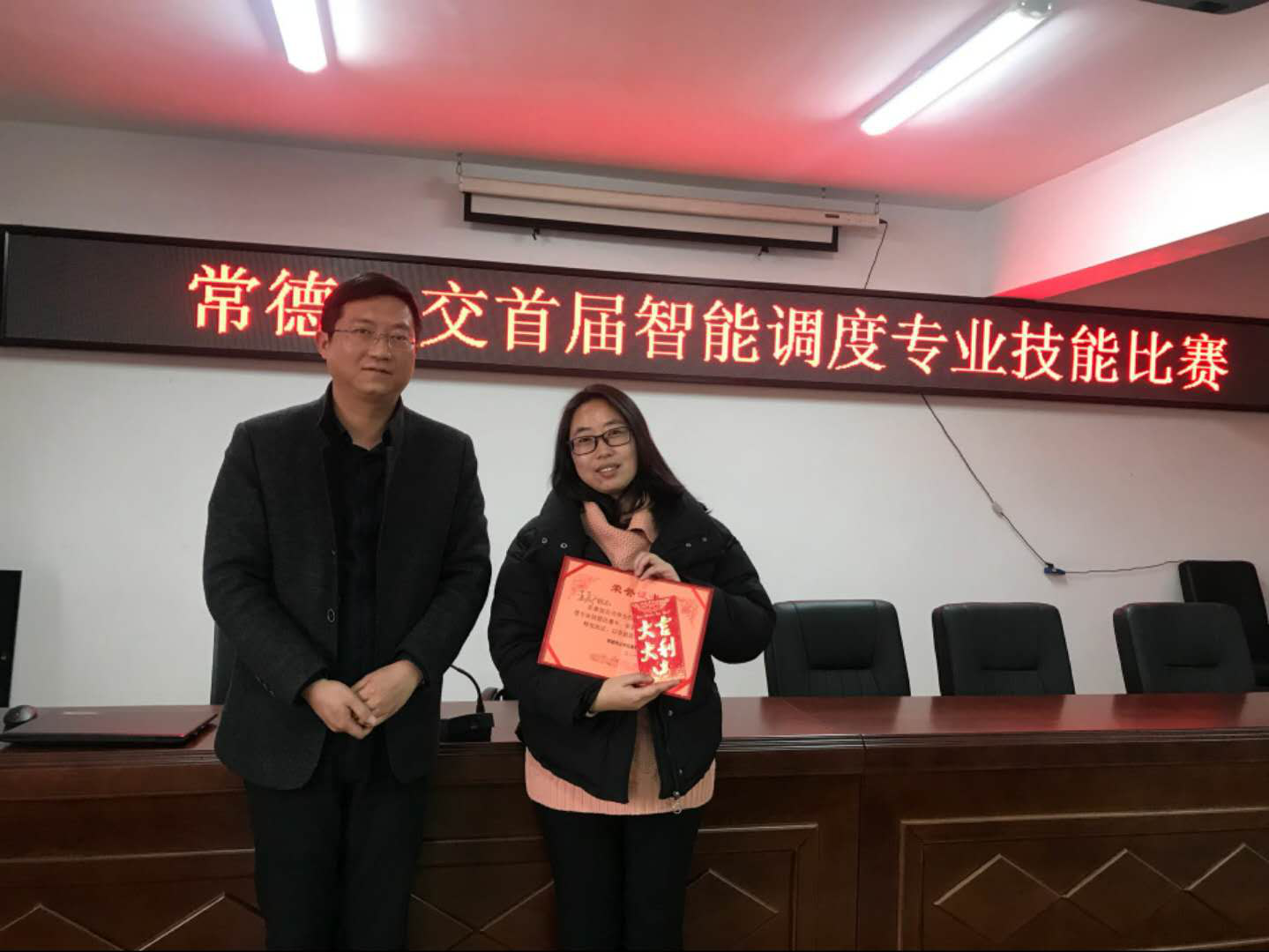 图为第二名获得者丁威、邓文娟登台领取奖励金和荣誉证书