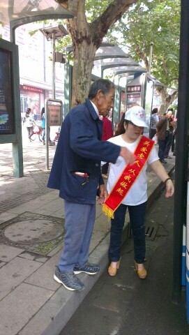 ಞ    自愿者者们身披紫色自愿者者体恤,头戴自愿者帽,身佩绶带,在下南门等交通量集中化的路段的、停靠站向往事环卫工人领取尊老尊老敬老养老积极引导书,积极引导全社交互相参入到关爱留守儿童中老年性健康人的统一预期在行动中。与此并且,自愿者者们还要各停靠站好处扶起中老年性健康人下上车、过路道,走到公交车站站车呼吁列车员主动权给中老年性健康人等统一预期在行动不快捷的列车员让座。公交车站站自愿者者们用预期统一预期在行动网络传播呼吁尊老尊老敬老养老文化中央空调尚,拥有了喧闹市內1道艳丽的自然风光线。